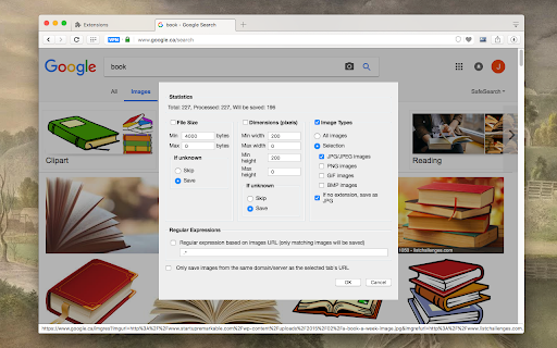 This is a bulk image downloader to extract all photos from the current web page. This online image downloader provides highly customizable filters based on file size, image size, and more!